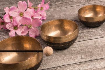 Auf den Körper gelegte Klangschalen verbreite sanfte Vibrationen in den Körper. Ein sphärischer Klang ertönt im Raum.